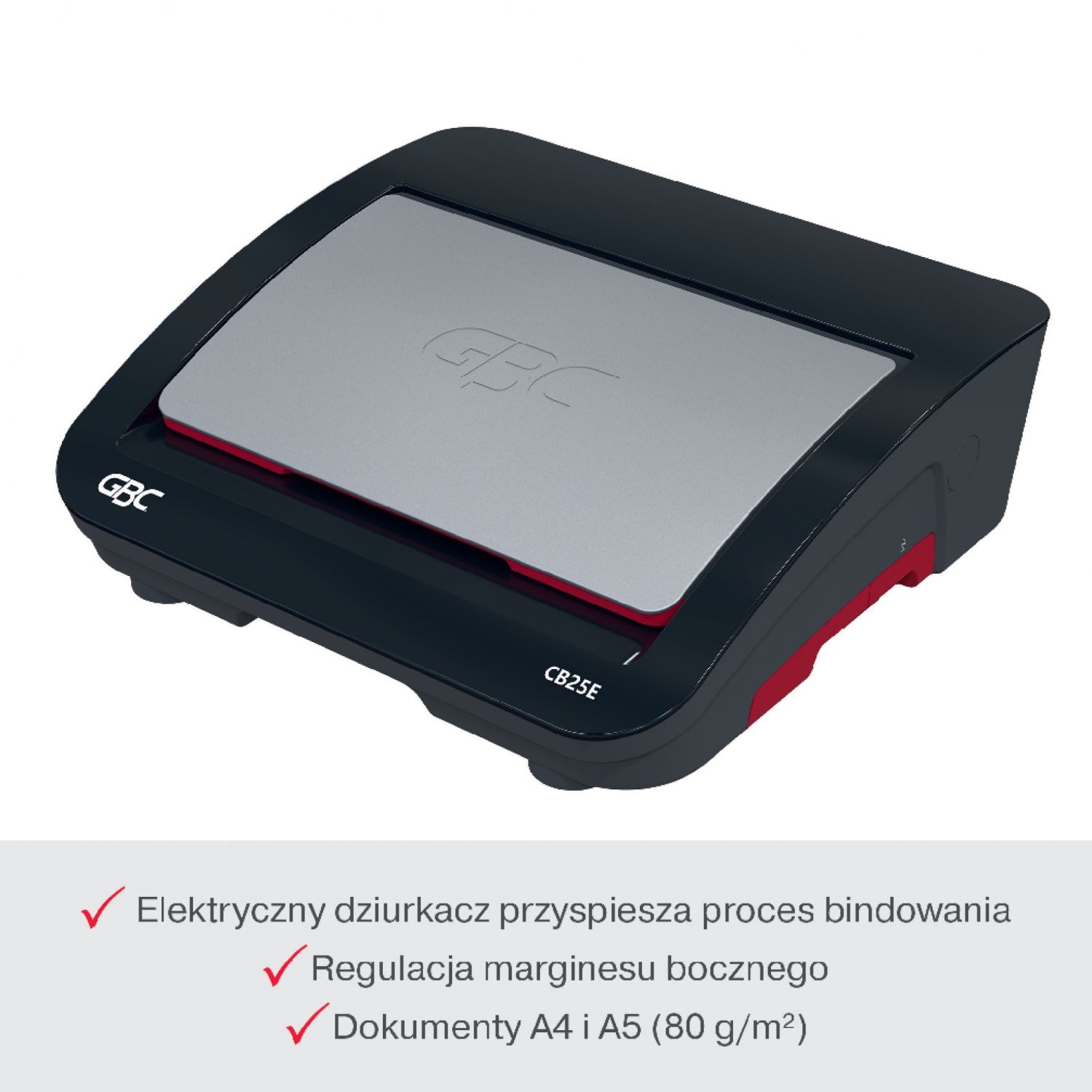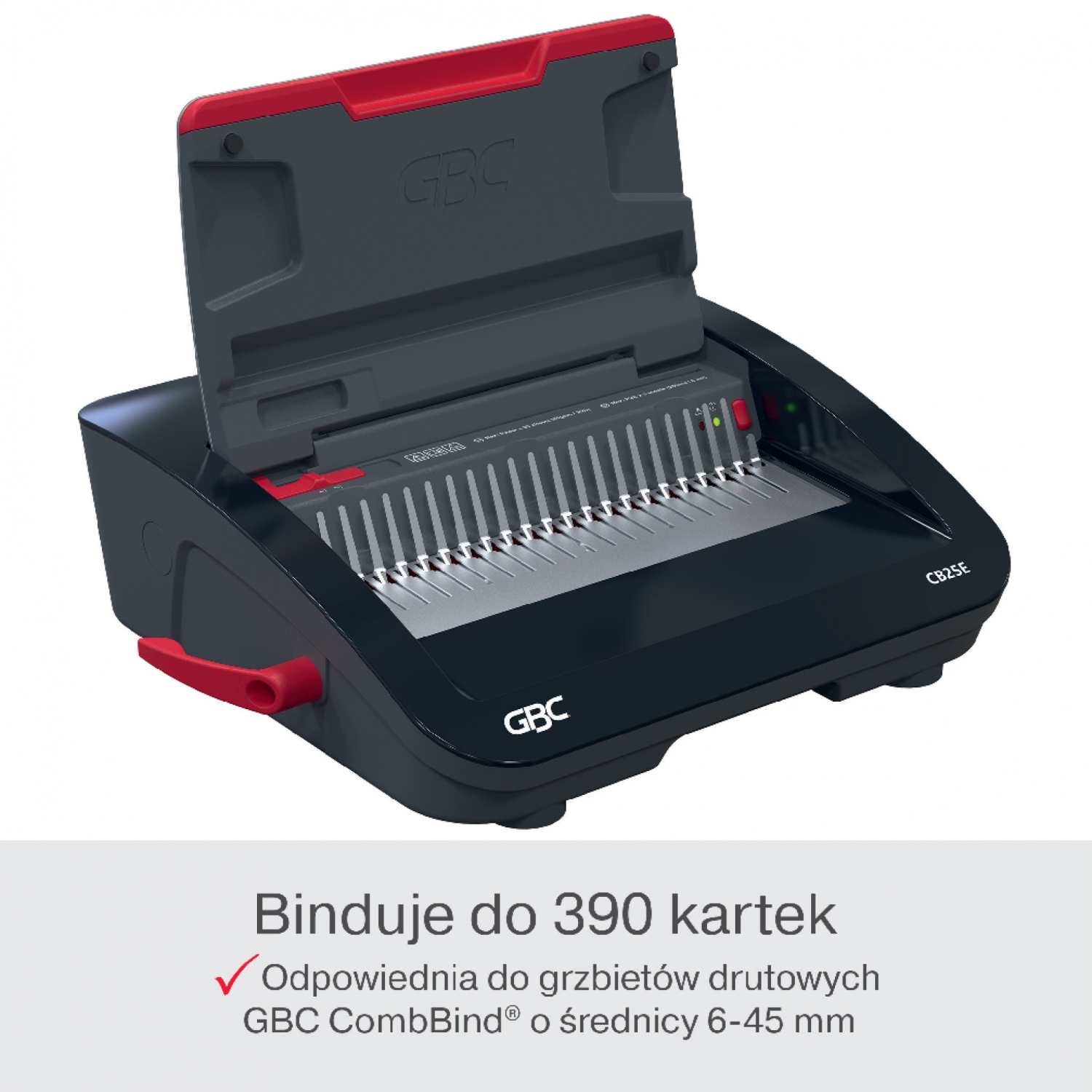 Zwiększ wydajność pracy w swoim biurze dzięki CombBind® CB25E, najnowocześniejszej elektrycznej bindownicy przeznaczonej do miejsc o dużym natężeniu pracy, takich jak ruchliwe biura i placówki edukacyjne. To solidne urządzenie usprawnia proces oprawy, bez wysiłku dziurkując pliki do 25 kartek o gramaturze 80 g/m2 i bezpiecznie bindując do 390 kartek przy użyciu grzbietów o średnicy 45 mm. Dzięki lekkiej i smukłej konstrukcji urządzenie można łatwo transportować i przechowywać, co czyni je doskonałym uzupełnieniem każdego miejsca pracy. Model CB25E zaprojektowano z myślą o wygodzie użytkownika - jest on wyposażony we wskaźnik LED informujący o załadowaniu zbyt dużej liczby kartek, co pozwala zapobiegać zacięciom i zapewnia płynny proces bindowania za każdym razem. Posiada także tackę na ścinki i poręczny schowek, które pomagają zachować porządek w miejscu pracy. Kolor czarny i srebrny.