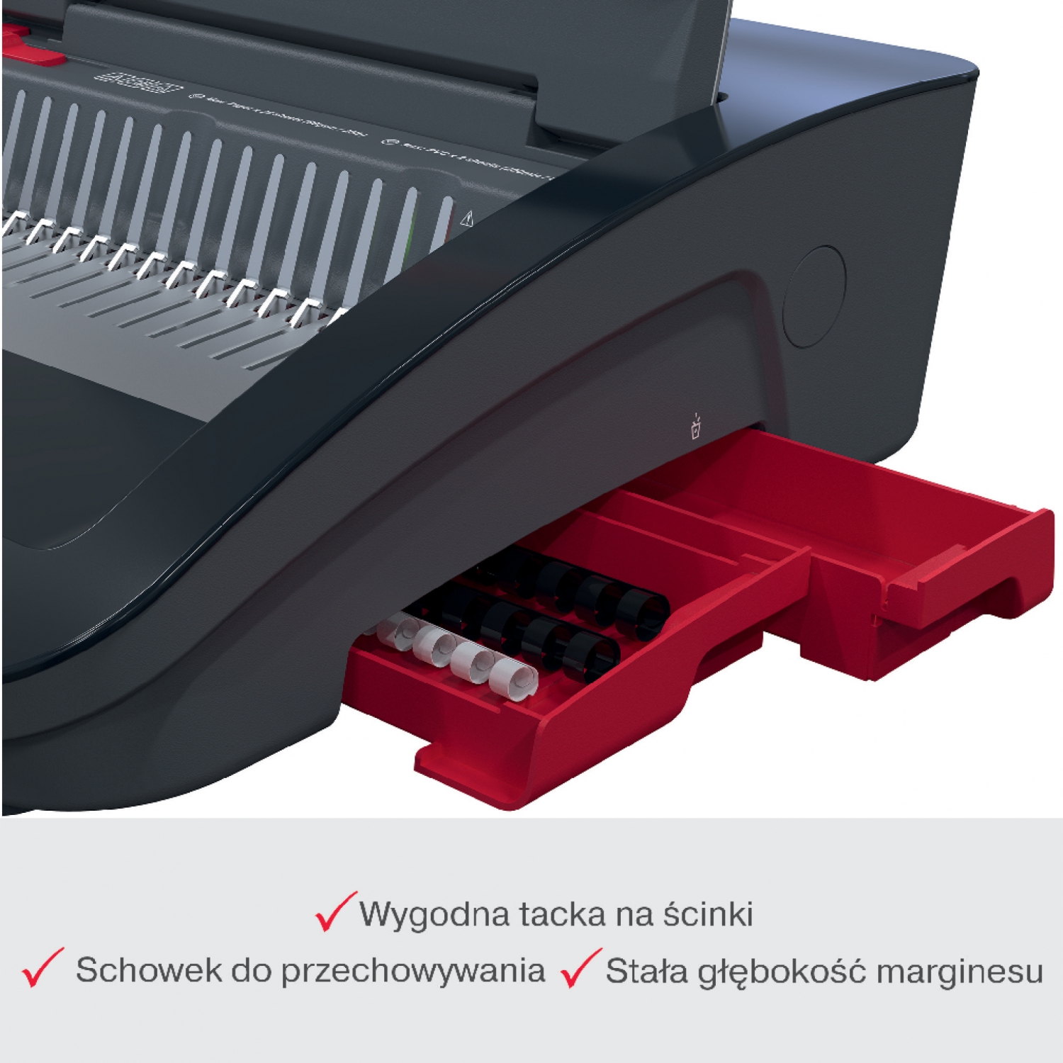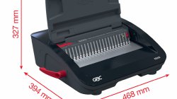 - Binduje do 390 kartek A5/A4 (80 g/m2) przy użyciu grzbietów o średnicy 45 mm.