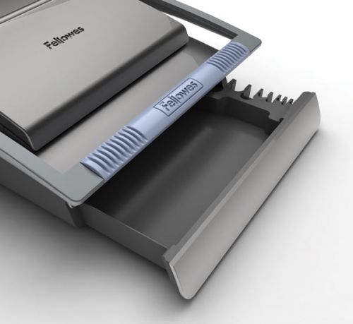 • Specjalna szuflada do przechowywania okładek A4 oraz grzbietów z wbudowanym z boku opatentowanym systemem mierzenia grubości dokumentów i doboru odpowiedniego grzbietu
