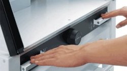 Profesjonalna gilotyna z panelem dotykowym oraz sterowaną wiązką światła podczerwonego kurtyną bezpieczeństwa.