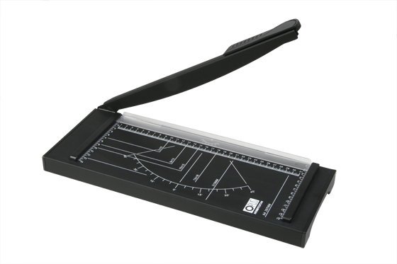 Niewielkich rozmiarów obcinarka przeznaczona do cięcia papieru. Posiada metalową podstawę z naniesionymi formatami oraz plastikową listwę docisku,