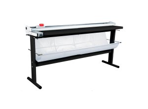 Profesjonalny trymer do dużego formatu, zainstalowany na solidnym, metalowym stojaku, wyposażony w płynnie poruszające się ostrze, automatyczny system docisku, wyposażony