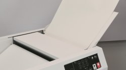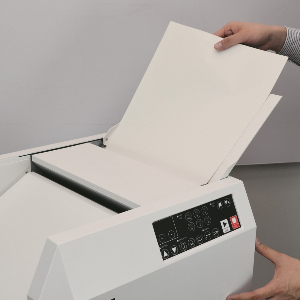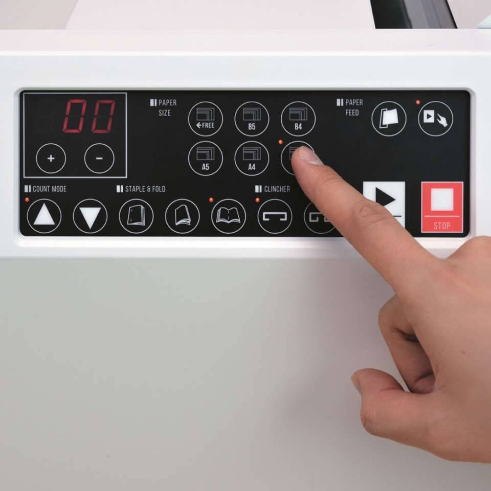 Kompaktowa broszurownica biurowa pozwalająca złożyć do 800 książeczek na godzinę. Twoje dokumenty zostają automatycznie złożone i/lub zszyte dosłownie w kilka sekund. Idealnie nadaje się do biur, małych firm, szkół, uczelni, punktów ksero, drukarń itp. Maksymalny format pracy A3 plus. Przejrzysty panel sterowania pokazuje aktualny postęp pracy, różnego rodzaju ustawienia, a także kody błędów, które wskazują np. zacięcie papieru lub pusty pojemnik na zszywki. Wszystko to sprawia, że urządzenie jest łatwe w użyciu. Czytelny wyświetlacz cyfrowy LED zliczający w górę lub w dół. Zszywanie i pozycja składania jest automatycznie dostosowywana do wybranego rozmiaru papieru. Bezpośrednio przyciskiem możliwe jest ustawienie standardowych formatów papieru takich jak: A5, A4, A3, B5 i B4. Dodatkowo, dowolny rozmiar papieru można zaprogramować z dokładnością do milimetra pod przyciskiem “FREE”. W trybie automatycznym, czujnik wykrywa arkusze z podajnika i automatycznie składa i/lub zszywa zszywkami. W trybie ręcznym proces uruchamiany jest dopiero po wciśnięciu przycisku “START”. Dostępne są trzy tryby: Tylko zszywanie / tylko składanie / zszywanie i składanie. W zestawie z broszurownicą zawarty jest wygodny koszyk do przenoszenia gotowych broszur oraz zestaw 5000 sztuk zszywek