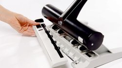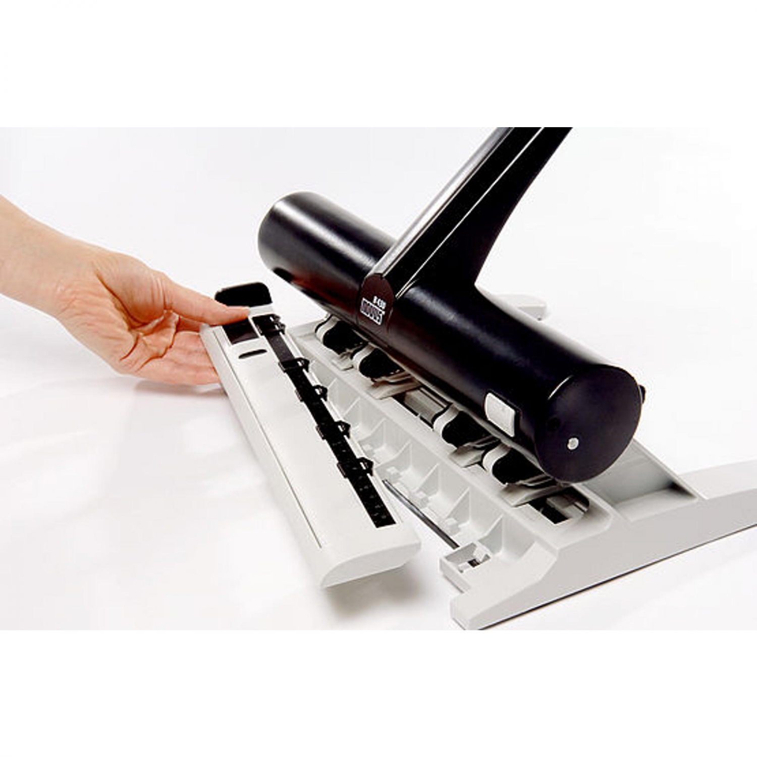 Łatwy w użyciu dziurkacz wielootworowy Novus B430. Dziurkacz o zmiennym rozstawie dziurek do różnych systemów segregatorów i organizerów. Solidne 4-krotne dziurkowanie ze zmiennymi odstępami dziurek. Przy użyciu dwóch dodatkowych dziurkownic, możliwość perforacji sześciu punktów równocześnie. Posiada ogranicznik formatu. Wykonany w całości z metalu, z antypoślizgową podstawą. Kolor szaro-czarny.