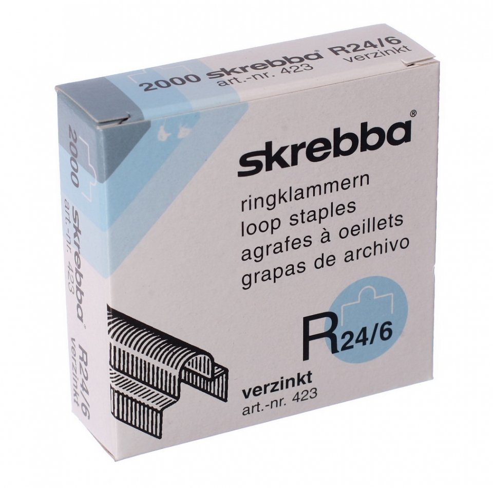 Zszywki z oczkiem Skrebba R24/6 - opakowanie 2.000 sztuk. Zszywki z oczkiem tzw. eurozszywki, ostrzone na końcach. do zszywaczy broszurujących. Producent skrebba Niemcy.