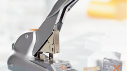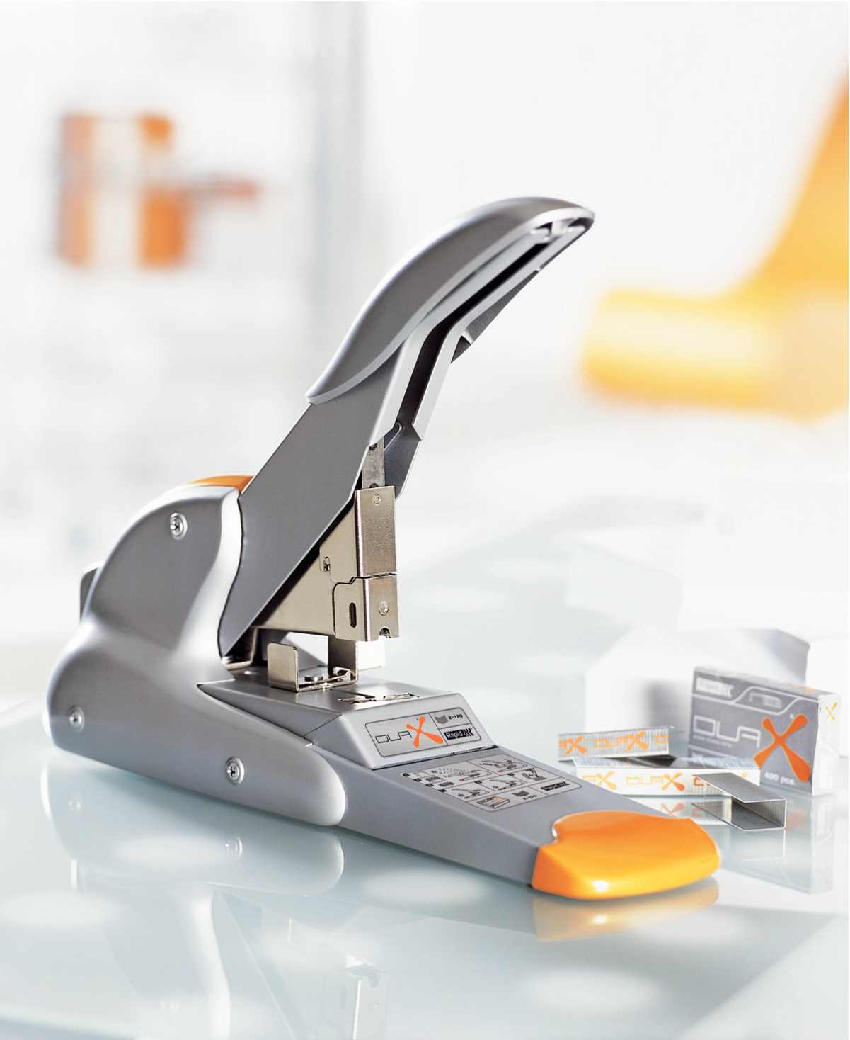 Innowacyjny, opatentowany zszywacz. Dzięki mechanizmowi obcinającemu, nadmiar zszywek pod plikiem jest ucinany, a zszywka zostaje dodatkowo zagięta na płasko. Powstałe zszycie jest płaskie i eleganckie, a plik łatwo daje się wkleić w okładki. Posiada ergonomiczny, opływowy kształt i nowoczesną kolorystykę.