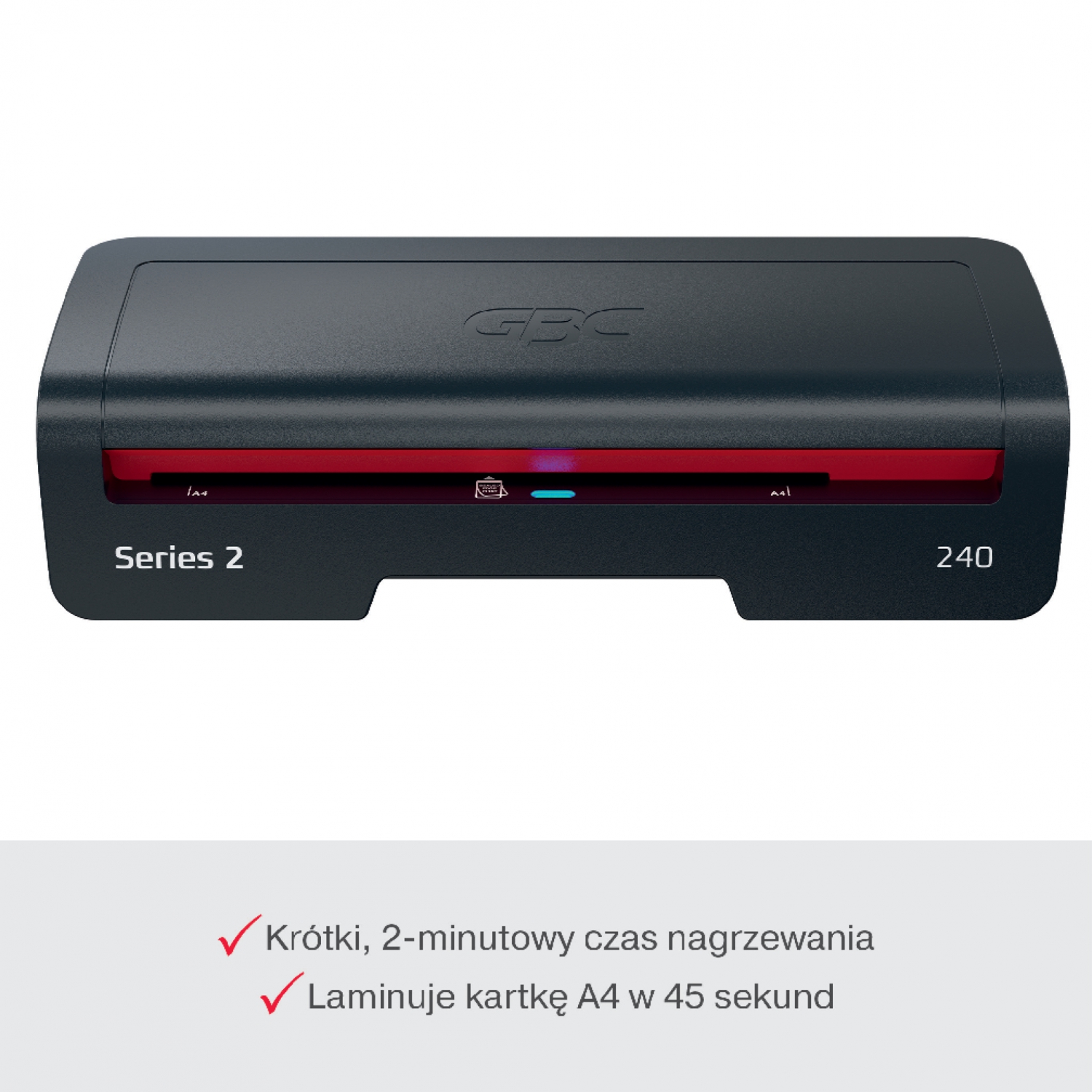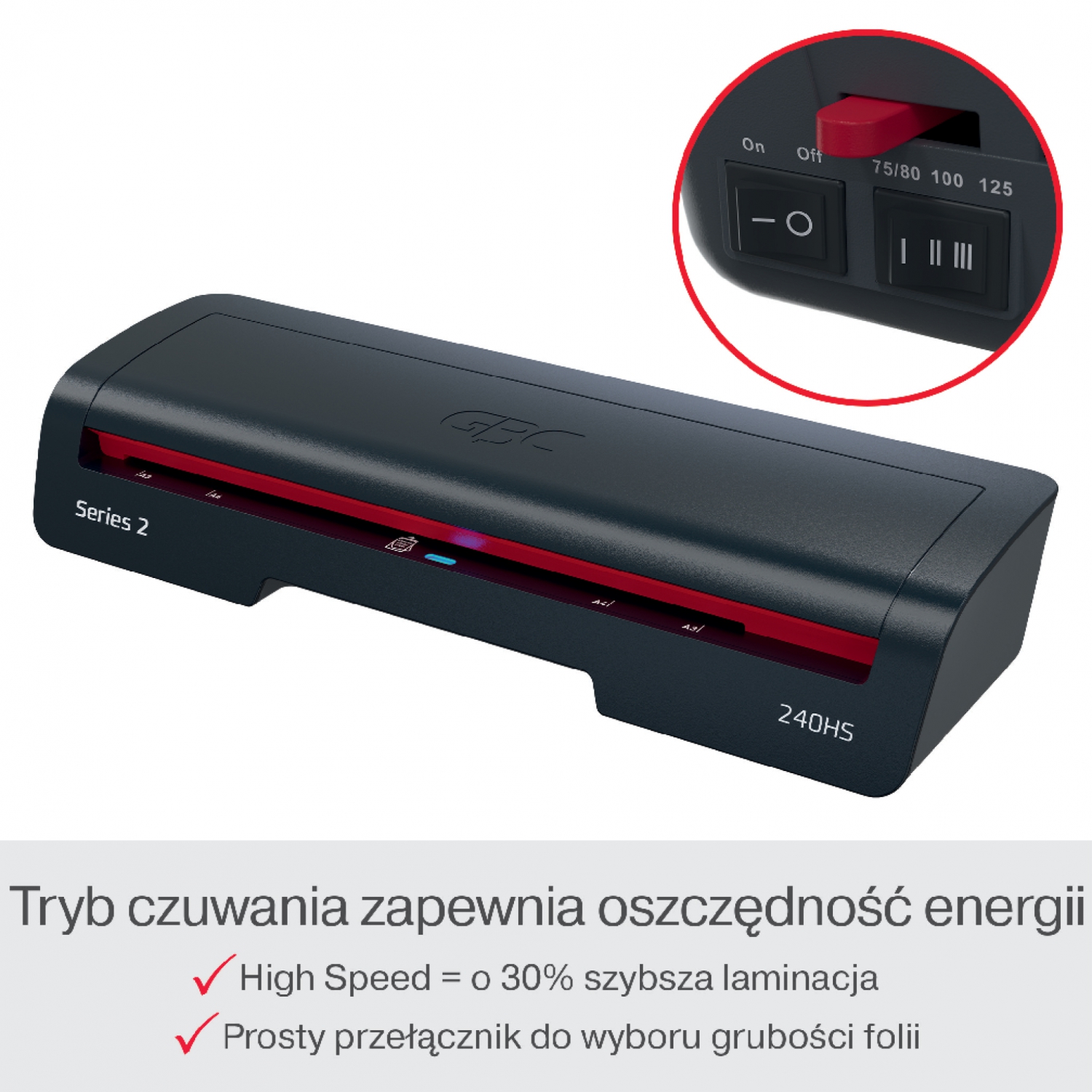 Model GBC 240HS to niezawodne i wydajne urządzenie przeznaczone do codziennego użytkowania. Został zaprojektowany dla różnych środowisk pracy - zapewnia szybką laminację. łącząc wydajność z łatwością obsługi. Zwiększ produktywność i skróć czas laminacji o 33%, korzystając z folii do laminacji GBC HighSpeed. Zapewnia krótki, 2-minutowy czas nagrzewania i laminuje kartkę A4 foliami o grubości 75 mikronów w zaledwie 45 sekund, co pozwoli Ci efektywnie pracować nad przygotowaniem projektów i prezentacji w domu. Łatwy w użyciu przełącznik oferuje trzy ustawienia grubości folii w zakresie od 75 do 125 mikronów, zapewniając elastyczność wyboru dla różnych typów dokumentów. Posiada dźwignię do uwalniania zakleszczonych materiałów, która zapewnia łatwe usuwanie nieprawidłowo podanych folii i płynną pracę. Dodatkowo, diody SMART ułatwiają obsługę, informując o stanie urządzenia przy użyciu sygnałów wizualnych i dźwiękowych: kolor czerwony oznacza nagrzewanie, a kolor niebieski i sygnał dźwiękowy - gotowość do pracy, a funkcja automatycznego wyłączania po 15 minutach bezczynności pozwala na oszczędność energii. Chroń i przedłużaj żywotność ważnych dokumentów, nadając im idealne wykończenie za każdym razem. Kolor czarny i czerwony.