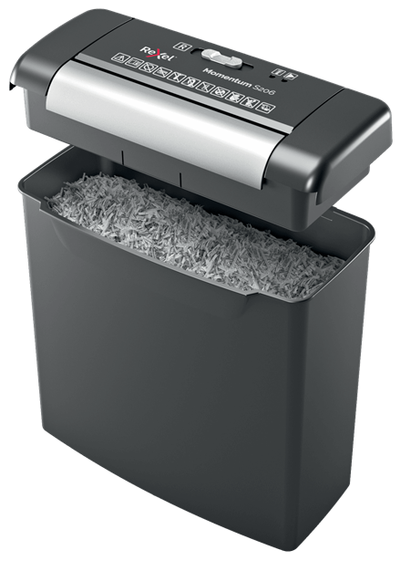 Posiada moc, aby niszczyć więcej! Niszczarka Rexel Momentum S206 niszczy do 6 kartek jednocześnie i może pracować nieprzerwanie przez 2 minuty - idealnie nadaje się do użytku domowego. Tnie na paski o szerokości 6 mm, gwarantując tym bezpieczeństwo na poziomie P2. Posiada 9-litrowy pojemnik na ścinki, który mieści do 75 kartek A4.