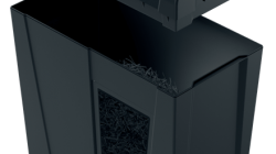 10-litrowy pojemnik na ścinki (mieszczący 75 pociętych kartek A4) ze zdejmowaną głowicą niszczarki i okienkiem umożliwiającym podgląd zawartości.