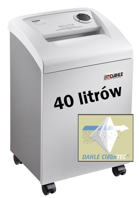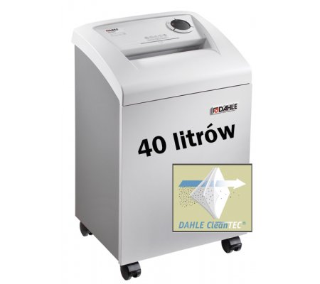 Niszczarka wyposażona w unikalny system filtracji CleanTEC® eliminujący mikropyłki powstające podczas niszczenia papieru oraz dla wygody system Dahle Safe Technology. Dzięki systemowi CleanTEC® powietrze wewnątrz pomieszczeń nie jest zanieczyszczane. Wyposażona w mocny i wyjątkowo cichy silnik przystosowany do dużych obciążeń. Posiada monolityczne wałki tnące wykonane z twardej stali, odporne na zszywki i spinacze biurowe. Łatwa w obsłudze elektronika sterująca z funkcją start/stop uruchamianą fotokomórką. Ergonomiczny panel pokazujący stan urządzenia. Łatwe i bezpieczne podawanie papieru. Automatyczne wyłączanie silnika przy zapełnionym koszu na ścinki lub przy otwartych drzwiach. Wyposażona w auto-revers. Niszczarka z funkcją oszczędzania energii. Przechodzi w stan uśpienia po 10 minutach bezczynności oraz wyłącza się całkowicie po 30 minutach. Posiada szerokie drzwi ułatwiające opróżnianie kosza na ścinki. Obudowa na kółkach z hamulcem unieruchamiającym niszczarkę. Wysokiej jakości drewniana obudowa. Załączone dodatkowe 10 worków.