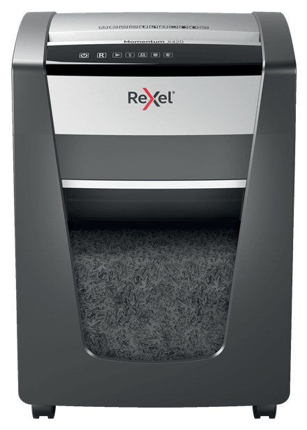 Niszczarki Rexel Momentum z technologią zapobiegania zacięciom są idealne do niszczenia poufnych dokumentów w biurze. Model P420+ niszczy jednocześnie do 20 kartek A4 (80 g/m²) podawanych ręcznie. Tnie na konfetti o wymiarach 4 x 35 mm, zapewniając poziom bezpieczeństwa P-4. Aby zapobiec zacięciom w niszczarce, czujnik na bieżąco monitoruje liczbę podawanych kartek. Urządzenie działa tylko wtedy, gdy liczba kartek nie przekracza ustalonego limitu – o przekroczeniu limitu informuje czerwona kontrolka LED. Duża pojemność podajnika, długi czas nieprzerwanej pracy - do 4 godzin oraz duży, 30-litrowy pojemnik na ścinki pozwalają na użytkowanie niszczarki w zakresie od umiarkowanego do intensywnego. Nie ma potrzeby usuwania zszywek i spinaczy z dokumentów.