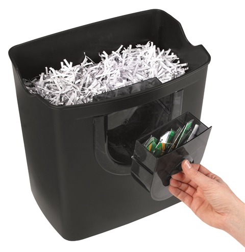 • Dwa osobne mechanizmy tnące i osobne pojemniki na ścinki z papieru oraz płyt CD, DVD, kart płatniczych i kredytowych