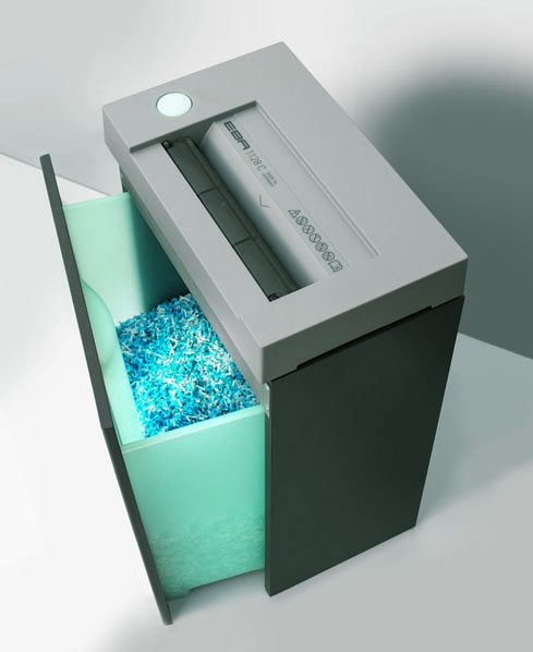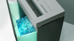 Innowacyjna i kompaktowa niszczarka przybiurkowa z wielofunkcyjnym, podświetlanym przyciskiem EASY-Touch oraz wysuwanym koszem na ścinki.