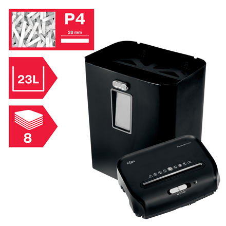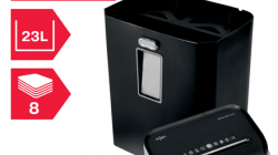 Niszczarka Promax QS REX823 niszczy do 8 kartek (80 gsm) jednocześnie, tnąc je na konfetti o wymiarach 4 x 40 mm, co zapewnia poziom bezpieczeństwa P-4. 23-litrowy pojemnik na ścinki zmieści 240 pociętych kartek A4.
