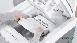 Poziom bezpieczeństwa DIN P-4, tnie na konfetti o wymiarach 4 x 36 mm. Obudowa niszczarki nie posiada okienka przez które widać cząsteczki papieru, dzięki czemu pozostają one ukryte do momentu opróżnienia pojemnika.