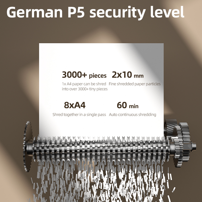 • poziom bezpieczeństwa wg DIN 66399: P-5 – wysoki stopień ochrony danych