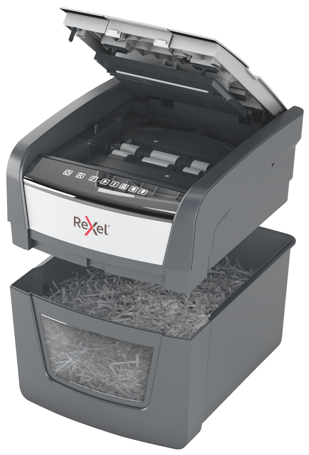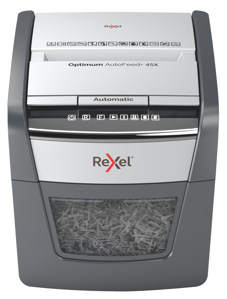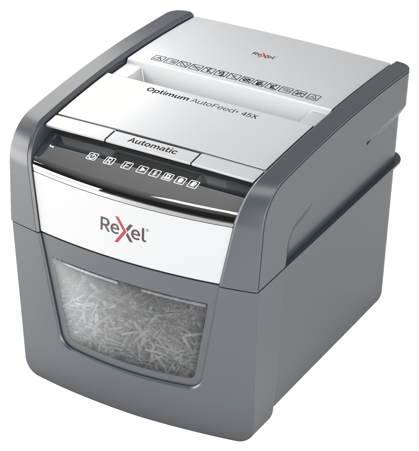Niszczarka automatyczna do papieru Optimum AutoFeed 45X jednorazowo niszczy automatycznie do 45 kartek A4 (80 gsm), tnąc arkusze na konfetti (o wymiarach 4 x 28 mm), co zapewnia poziom bezpieczeństwa P-4. Wyposażona jest w automatyczny podajnik i kompaktowy, 20-litrowy pojemnik na ścinki, co sprawia, że idealnie nadaje się do użytku w domu lub w domowym biurze. Nie wymaga ręcznego podawania papieru ani wcześniejszego usuwania zszywek i spinaczy - ta automatyczna niszczarka całą pracę wykona za Ciebie